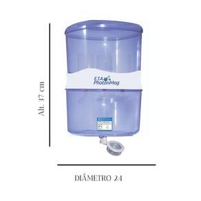 Purificador Ionizador Água Alcalina Tipo Galão para Base refrigerada - 3 velas CERTIFICADO INMETRO 001574/2021 Atende famílias e escritórios de até 5 pessoas, após o enchimento do primeiro reservatório Equipado Boia dosadora que aumenta a capacidade de armazenamento. Velas vazão de 350 a 400 Ml por hora Medidas: 47 alt X 24 prof. X 24 larg Capacidade de armazenamento: 13,5 litros