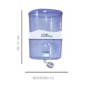 Purificador Ionizador Água Alcalina Tipo Galão para Base refrigerada - 3 velas CERTIFICADO INMETRO 001574/2021 Atende famílias e escritórios de até 5 pessoas, após o enchimento do primeiro reservatório Equipado Boia dosadora que aumenta a capacidade de armazenamento. Velas vazão de 350 a 400 Ml por hora Medidas: 47 alt X 24 prof. X 24 larg Capacidade de armazenamento: 13,5 litros