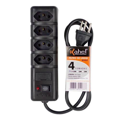 FILTRO LINHA 4 TOMADAS BIVOLT KAHELFiltro de linha com fusível 4 tomadas 2p+t cabo 1,12 metros.Filtro de linha com fusível de proteção. Cabo 1,12mModelo: 4 tomadas / ABS: PretoBivolt: pode ser utilizado em 110/127 e 220 volts / Tipo de tomada: NBR14136 10AAplicação: eletrônicos, smartphones, tablets, laptops, impressoras, computadores, videogames entre muitos outros aparelhos.Iitens Inclusos: 1 filtro de linha Kahel com corpo plástico ABS com 4 tomadas