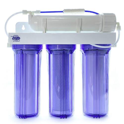 Três carcaças transparente 10 Chave para abrir as carcaças Suporte triplo de ferro que pode ser pendurado na parede Elemento filtrante polipropileno 10 5 micras Elemento filtrante carbon block 10 5 micras Cartucho recarregável 10 Resina mista purolite mb-478 Carcaça para membrana de or Membrana de ro 150 gpd Conectores cotovelo com encaixe Restritor de fluxo Mangueira 5 metros Conector para torneira. Durabilidade da membrana 12 a 18 meses A resina mista dura em media de 1200 litros