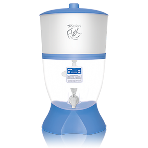 Filtro Stéfani Flex azul com capacidade de 6 litros, equipado com vela tradicional, torneira Stéfani Clic e boia que duplica a capacidade.Bica móvel