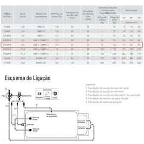 Diâmetro: 550mm Peso: 14,2kg Motobomba recomendada: NBF-3 Modelo do filtro: F550P Vazão: 9,5m/h Quantidade de sacos de areia: 5 Quantidade de sacos zeolita: 3 Área filtrante: 0.24m Volume piscina: 40.000 a 57.000 L