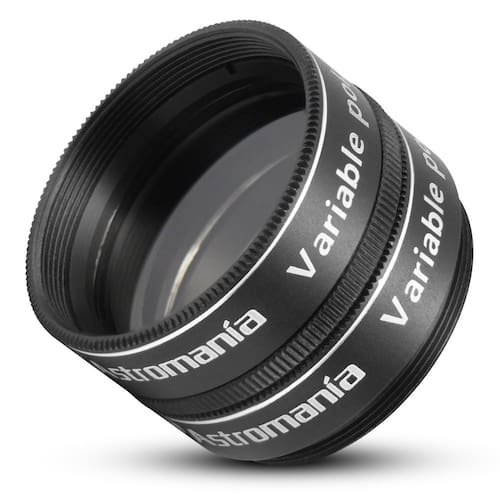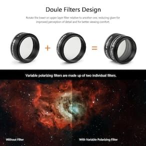 Astromania Filtro polarizador cinza variável de 3,15 cm - Este filtro polarizador variável tem um suporte de material de alumínio, que é resistente e durável. - Ajuda você a ajustar o brilho de forma eficaz. O filtro polarizador variável permite o ajuste seletivo do brilho, o que é útil para observação terrestre. - Estes filtros têm uma ampla variedade muito grande de eficácia. A transmissão de luz dos filtros polarizadores está entre 1% e 40%. - Os filtros polarizadores variáveis são compostos por dois filtros individuais. O efeito de escurecimento variável é produzido girando o filtro inferior em relação ao superior. E reduz o brilho para melhorar a percepção dos detalhes e para melhor conforto de visualização. - Serve para todas as oculares de 3,15 cm com a rosca de filtro padrão.