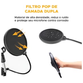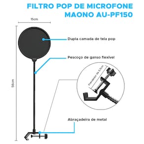 A compatibilidade universal do filtro pop o torna compatível com a maioria dos microfones e suportes disponíveis no mercado, permitindo uma instalação rápida e fácil. Seu design discreto na cor preta combina com qualquer setup, proporcionando um visual profissional ao ambiente de gravação. Além disso, sua construção resistente garante durabilidade e eficiência por longos períodos de uso.