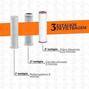 3 estágio de filtragem: elemento filtrante polipropileno plissado absoluto, indicado para filtração de vírus e bactérias com até 0,22 microns