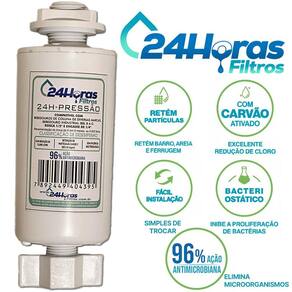Filtro Refil Bebedouro Pressão Coluna Bag Compatível Várias Marcas Universal Filtro Refil 24H-PRESSAO compatível com Bebedouro de Coluna de diversas marcas Compatível com as marcas abaixo e diversas outras marcas: - IBBL BAG bag 40, bag 80 - Karina K40i, K40, K40ci - masterfrio Mf40, Mfa40 - hiza Hpa, Hpx, Hga, Hgx - Begel - Belliere - Tecnigel - Diplomat - Pologel - WFS - WDS - entre muitas outras. - Troca Rápida e Fácil - De um lado tem rosca de 1/2 com porca travante - Do outro, encaixe de 1/4 para tubo ou mangueira - Filtro deve ser trocado de 6 a 6 meses, conforme manual do aparelho - O filtro elimina: Cloro, Gostos, Cheiros, Partículas Sólidas e ajuda a Elevar o pH. As marcas e produtos citados e ilustrados são propriedades de seus respectivos fabricantes e aparecem apenas para demonstrar a compatibilidade deste produto. --------------------------------------------------------------------------- Marca: 24 Horas Filtros Eficiência da retenção de partículas: Classe III Eficiência da redução de Cloro livre: Aprovado Eficácia Anti-Microbiana 96%: Aprovado Produto de acordo com a norma ABNT NBT 16098:2012. Elemento filtrando destinado ao uso em água que atenda a portaria N 2.914 do Ministério da Saúde. Marca: Não Informado Ean: 7892449404395