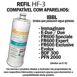 Filtro Refil Compatível IBBL C+3 Natural Due FR600 Immaginare Filtro Refil HF+3 Purificadores de Água IBBL Modelos que possuem água gelada:- Immaginare- Due- E-Due- FR600 Speciale- FR600 Expert- FR600 Exclusive- Evolux- BDF 300- PFN 2000 Filtro equivalente ao refil C+3. Fazer a troca do filtro é realmente muito simples e leva cerca de 3 minutos. É só girar e trocar. As orientações de como fazer a troca vão no filtro. O filtro deve ser trocado a cada 6 meses, ou antes, caso estime que seja consumido 4000 litros em menos de 6 meses. O filtro remove o cloro da água, elimina sabores, retém partículas de sujeira, barro, ferrugem, eleva o Ph, além de ter ação bacteriostática. As marcas e produtos citados e ilustrados são propriedades de seus respectivos fabricantes e aparecem apenas para demonstrar a compatibilidade deste produto. --------------------------------------------------------------------------- Fabricante/marca do refil: HidrofiltrosModelo do produto: HF+3Eficiência da retenção de partículas: Classe IIIEficiência da redução de Cloro livre: AprovadoEficiência bacteriológica: não se aplica Produto de acordo com a norma ABNT NBT 16098:2012. Elemento filtrando destinado ao uso em água que atenda a portaria N 2.914 do Ministério da Saúde.