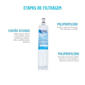 Filtro refil com tripla filtração, alta eficiência na retenção de resíduos suspensos, máxima redução de cloro, elimina odores e sabor desagradável. Vazão: 40 l/h. Pressão: 19,6 a 392 kpa. Vida útil: 2500 l.Tipo