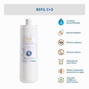 Filtro refil ibbl c+3 para purificador de água ibbl Filtro refil ibbl c+3 para purificador de água ibbl O refil girou trocou c+3 possui o sistema de tripla filtragem, que retém as impurezas da água como barro, ferrugem e sedimentos. Reduz o cloro e elimina sabores e odores indesejáveis. Prático sistema refil girou trocou garante ao usuário uma fácil do refil e manutenção do equipamento. Filtro refil ibbl c+3 para purificador de água ibbl Características gerais : Produtos compativeis: immaginare, evolux, fr600 speciale, fr600 exclusive, fr600 expert, fr600, frq600 expert, frq600, pfn, atlantis, pdf. Vida útil: 3.000 l ou até 6 meses. 3 etapas de filtragem Eficiência de retenção de partículas Elimina odores Elimina sabores Bacteriostático: controla a proliferação de bactérias Marca: Não Informado
