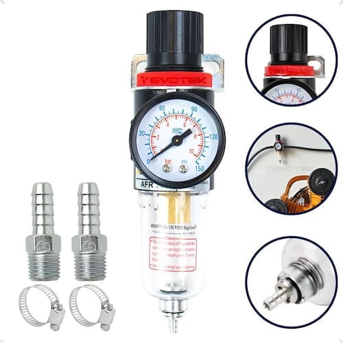 Liberte todo o potencial do seu compressor e garanta precisão absoluta em cada aplicação. Potencialize seu trabalho e proteja seus equipamentos com o Filtro Regulador Evotek, a solução definitiva para ar comprimido puro e controlado. Principais Benefícios: Ar Limpo e Puro: Elimina água, óleo e impurezas, prolongando a vida útil de ferramentas pneumáticas e revestimentos. Controle Preciso: Manômetro integrado com medição exata 0-10 Bar para otimizar o desempenho e evitar danos. Fluxo Potente: Vazão impressionante de 2300 L/Min. A 7 Bar, ideal para pistolas, borracharias e uso geral. Durabilidade Garantida: Corpo robusto em alumínio e copo em policarbonato resistente a impactos e corrosão. Instalação Fácil: Rosca de entrada e saída 1/4'' e suporte cantoneira para fixação rápida e segura. Especificações Técnicas: - Modelo: Filtro Regulador Ar Compressor 1/4'' - Fluido: Ar Comprimido - Rosca de Entrada: 1/4'' - Rosca de Saída: 1/4'' - Pressão de Trabalho: 0 a 10 Bar - Vazão a 7 Bar: 1/4'' NPT: 2300 L/Min. - Fixação: Suporte Cantoneira - Capacidade do copo: 0,15 L - Corpo: Alumínio - Copo: Policarbonato - Vedação: Buna-N Acompanha: - 01 Filtro Regulador Ar Compressor - 01 Manômetro - 01 Suporte para Fixação - 02 Espigão - 02 Abraçadeira Invista em performance e longevidade para seus equipamentos pneumáticos. Adquira agora o seu Filtro Regulador Evotek e sinta a diferença Marca: Não Informado
