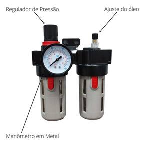 Marca: Rotta Tamanho da porta: 1/4 Rosca do Manômetro: 1/4 Rosca de entrada e saída: 1/2 Vazão: 7 bar BSP 1.230 l/min Faixa de Pressão: 0 a 10 bar / 0 a 150 psi recomenda-se pressão máxima de 8,5bar Temperatura: 0 a 60ºC Material: Corpo em Alumínio zamak com pintura eletrostática / Copo em Policarbonato Capacidade do copo: 15ml ou 15cm Altura do copo: 9,3 cm Comprimento: 15cm Medida do ponto mais baixo até o centro da rosca 1/2 : 12cm Precisão de Filtração: 5um Capacidade Óleo: 90 cm Óleo Recomendado: ISO VG32 ou Equivalente Fluido de trabalho: Ar Peso: 645g sem embalagem