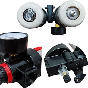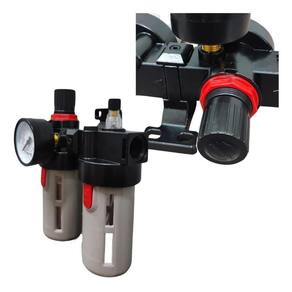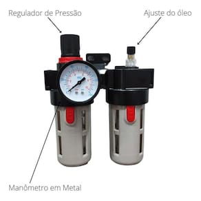 . Filtro regulador e lubrificador . É utilizado na pulverização de óleo no ar comprimido com o objetivo de proteger as peças móveis dos conjuntos pneumáticos . Possui regulagem de teor de óleo na cúpula visora, permitindo a visualização de gotejamento em 360º . Copo fixado por rosca o que facilita o acesso para limpeza, manutenção e recarga de óleo.