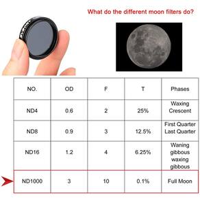O filtro de densidade neutra SV139 ND1000 permite a passagem de 0,1% da luz visível. A cor perfeitamente neutra não alterará a cor natural da lua. No momento em que você compra o filtro lunar SV139, você sentirá imediatamente o artesanato e a qualidade. Elimina imagens excessivamente brilhantes e desbotadas O kit de filtro lunar SV139" ND100 reduz o brilho, aumenta o contraste e a capacidade de discernir detalhes na Lua. Você pode ver mais detalhes lunares e características da superfície com seu telescópio. Estrutura de alumínio de alta qualidade. A superfície do filtro lunar SV139 foi projetada com um padrão trapezoidal CNC para garantir que o atrito aumente em uma grande área quando o usuário gira Universal Science: Gibbous Moon - A partir de agora, até que se torne nova novamente, a parte iluminada da Lua que podemos ver diminuições e dizemos que está diminuindo. Na primeira semana após a cheia, é chamada de giboso minguante. É muito bom usar o filtro ND1000 neste momento Especificações: Tipo: densidade neutra Material do filtro: estrutura de alumínio, fio de metal e vidro óptico Diâmetro do cano: 1,25" Valor da densidade óptica: 3,0 Transmissão: 0,1% Rosca: padrão M28,5* 0,6 mm Peso líquido: 5,0 g/0,19 onças Nota: A ocular NÃO está incluída O pacote inclui: 1 × filtro ND1000 SVBONY de 1,25" 1 × estojo de plástico resistente - Filtro de densidade neutra ND1000; o filtro lunar de densidade neutra de 1,25" reduz o brilho para que você possa ver mais detalhes lunares e características da superfície com seu telescópio; reduz a quantidade de luz que atinge a lente sem afetar a cor - Tamanho padrão de rosca de 1,25 polegada; célula de filtro de metal se enrosca diretamente no cilindro de 1,25 polegadas da ocular do telescópio; conveniente e rápido - Excelente vidro óptico; bom desempenho óptico; excelente qualidade de imagem e reprodução de cores sem distorção; útil para telescópios astronômicos de diferentes calibres através dos quais a luz da lua pode ser extremamente impressionante - Material robusto; excelente grau de aviação estrutura de alumínio com acabamento em preto anodizado rígido; design esteticamente funcional - caixa requintada; equipada com uma caixa de filtro projetada profissionalmente; a caixa de filtro é leve e durável; compacta e elegante; uma esponja macia de tamanho fixo é instalada na caixa; o filtro pode ser fixado de forma estável