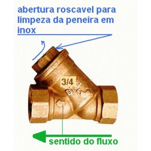 Elemento filtrante removível e lavável constituído por peneira em inox. Corpo em bronze com roscas em 3/4.