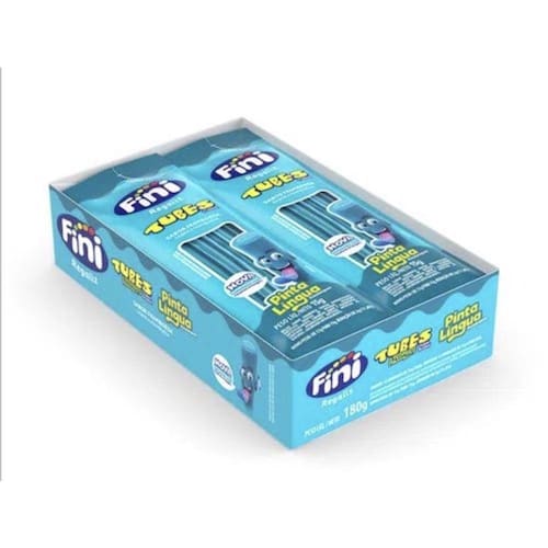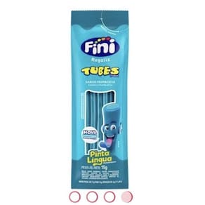 Caixa contendo 12 pacotinhos com bala de gelatina Fini tubes sabor Framboesa Pinta Língua com 15 gramas cada (3unidades). Peso total da embalagem 180 gramas.
