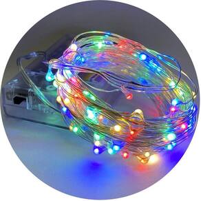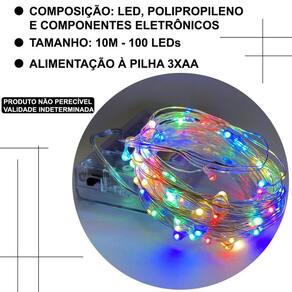 Fio de fada cordão decor fairy light 100led's colorido 10mNosso fairy light mais conhecido como fio de fada, possui um lindo led colorido que é incrível para iluminar ambientes internos, como o quarto ou a sala. Ele funciona com 3 pilhas, então não precisa se preocupar com tomadas, a decoração é livre decore seu mural de fotos, seu jantar romântico e até mesmo, combinado com um memory board mural de fotos para abrilhantar ainda mais sua decoração. Este fio de fada deixará qualquer ambiente com aquele clima de quarto das blogueiras.- possui 10 metros com 100 led's distribuídos;- ideal para decorar seus ambientes favoritos;- excelente para presentear um amigo.Especificações:- cor: colorido- material: led, polipropileno e componentes eletrônicos- tipo de alimentação: 3 pilhas aa não inclusas - tamanho: 10 metros- quantidade de led's: 100 led's- peso produto : 0,60g- volume: 01 peça- origem: china- marca: wincy casa Advertências- não instale em árvores que tenham arranjos, folhas ou galhos revestidos de metal ou metalizados;- não monte ou instale os fios de maneira que os mesmos possam ser danificados ou cortados;- apague-o quando sair de casa ou à noite.Itens inclusos:- 01 cordão fio de fada colorido 10mCód. Ref.- del50075