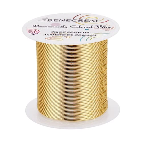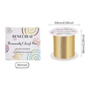 BENECREAT Fio de cobre para joias Especificação: Espessura: calibre 24/0,5 mm Comprimento: 80 m/87 jardas Cor: Ouro claro Características: Fio de cobre resistente a manchas Perfeito para fazer anéis, brincos, pulseiras e colares, joias de embrulho de arame, corrente de contas ou qualquer projeto de artesanato! - ?Flexibilidade?: O fio de cobre macio é moldável e flexível, fácil de moldar ou dobrar, boa qualidade para uso. - ?Medida?: O fio da joia tem 0,5 mm/calibre 24 de diâmetro, 80 m/87 jardas de comprimento por carretel. - ?Colorido permanente?: Cor dourada clara; revestimento resistente a manchas, colorido permanentemente esmaltado. - ?Uso amplo?: Ótimo para fazer componentes de joias, como corrente de malha, corrente com contas, argolas, fones de ouvido e pingentes embrulhados em arame. - ?Pacote de carretel conveniente?: Este fio de artesanato é embalado com um carretel resistente que é conveniente para retirar o fio de metal e mantê-lo organizado sem bagunça.