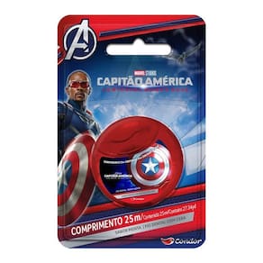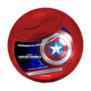 Características Adicionais: Fio dental com cera. Com um delicioso sabor menta. Caracterizado com o tema do Capitão America. Possui nova formulação exclusiva que não desfia e desliza melhor entre os dentes, removendo toda placa bacteriana dos espaços mais escondidos entre os dentes.