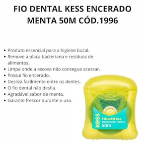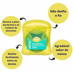 O Fio Dental Kess é um produto essencial para a higiene bucal. Ele remove a placa bacteriana e os resíduos de alimentos das áreas onde a escova dental não consegue acessar. Possui fio encerado que desliza facilmente entre os dentes e evita que o fio desfie. Além do agradável sabor de menta que garante frescor durante o uso. contém 50 metros.