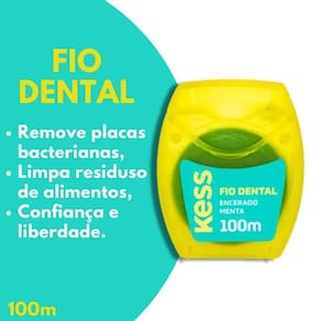 O Fio Dental Kess Menta é um produto essencial para uma higiene bucal completa. Com 100 metros de fio encerado, ele remove efetivamente a placa bacteriana e os resíduos de alimentos dos dentes, alcançando áreas onde a escova dental não consegue acessar. O fio encerado desliza facilmente entre os dentes, evitando que se desfie e garantindo uma limpeza profunda.