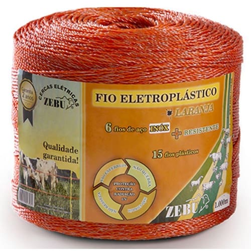 Fio eletroplastico laranja 1000m zebu Dica do vendedor: O fio eletroplástico laranja da zebu é muito duravel e resistente, um dos melhores do mercado; vale a pena. Características: Composto de 15 fios plásticos com tratamento uv e 6 fios de aço inox torcidos; Espessura 3mm Super resistente Fácil visualização e instalação Rolo com 1000 m Cor: laranja para fazer cerca elétrica, indicado para fazer cerca móvel. Prático para esticar e recolher Marca: Não Informado
