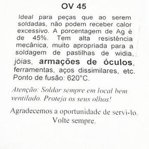 Ideal para peças que ao serem soldadas, não podem receber calor excessivo. A porcentagem de ag é de 45%. Tem alta resistência, mecânica muito apropriada para a soldagem de pastilhas de widia, jóias, armações de óculos, ferramentas, aços dissimilares, etc. Ponto de fusão 620 c.