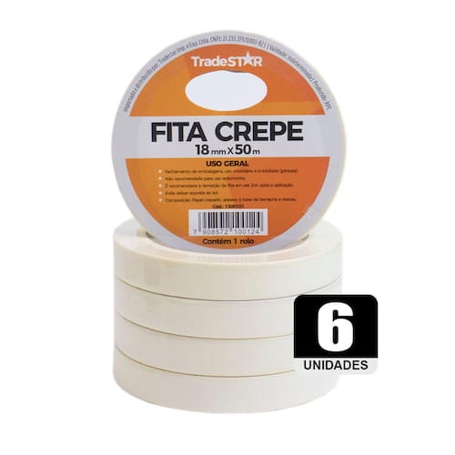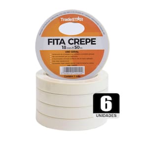 Kit com 6 Unidades Rolos Fita Adesiva Crepe Papel FITA ADESIVA DE 1ª LINHA, EMBALADA INDIVIDUALMENTE. Fabricada com materiais duráveis e resistentes, esta fita é perfeita para diversas aplicações, como pinturas, vedação, empacotamento e muito mais. Com um adesivo forte e de fácil remoção, a Fita Crepe p/ Uso Geral 18mm x 50m garante um acabamento perfeito sem danificar a superfície. Características Gerais: Facilidade de aplicação Remoção limpa a fita sai da superfície em um único pedaço sem deixar resíduos Conformidade a superfícies irregulares Desenrolamento leve Não deve ser utilizada para pintura automotiva. Deve ser removida em até 24 horas após a aplicação. Marca: TradeStar Rolo: 18mm X 50m Cor: Branca Material Adesivo à base de resina e borracha