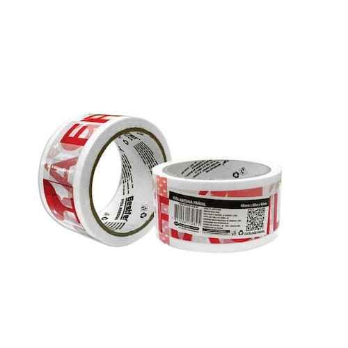 Fita adesiva para fechamento e sinalização de pacotes.Fundo branco com a inscrição FRÁGIL em letras vermelhas.Comprimento 5 metros, largura 4,8 cm. Espessura 43 micras.Peso 134 g. Ean: 7899206172825