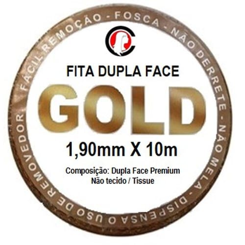 Fita adesiva, dupla face, GOLD, especial para fixação de perucas ou próteses. Produto de fácil remoção, fosca, não derrete, não mela, dispensa o uso de removedor. Rolos de 10 metros com 1,90 de largura