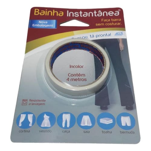 Desenvolvida especialmente para tecidos de algodão, a Bainha Instantânea Mágica também pode ser aplicada em outros tecidos com ótimos resultados. Com um comprimento de 4 metros e largura de 1 centímetro, você terá material suficiente para fazer diversas bainhas em cortinas, vestidos, calças, saias, bermudas e muito mais.