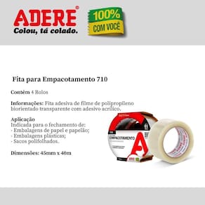 A Fita Adesiva Transparente para Empacotamento Uso Geral 45x40 710 Adere é muito utilizada por Comercio, Fabricas, Transportadoras e em sua Casa. Confeccionada em polipropileno biorientado transparente a Fita Adesiva Adere oferece a você fácil aplicação, boa adesão, adesivo acrílico à base dágua, além de ótima resistência e durabilidade em suas aplicações.