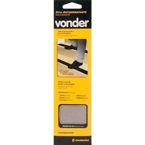 Fita Antiderrapante 50mmx220mm Transparente Com 6 Pç Vonder Conteúdo da embalagem 1 Cartela com 6 fitas antiderrapantes Aplicações e dicas de uso Indicada para locais sem incidência de umidade, como: pisos, degraus, rampas, escadas, skates, entre outros Destaques e diferenciais Ajuda na prevenção de acidentes em pisos lisos e escorregadios DETALHES TÉCNICOS