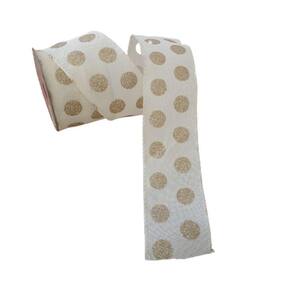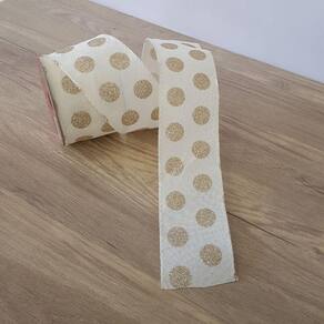 FITA ARAMADA EM TECIDO COM BOLINHAS ;DOURADAS, ROLO COM 9,14 METROS DE COMPRIMENTO X 6.30cm ;DE LARGURA.