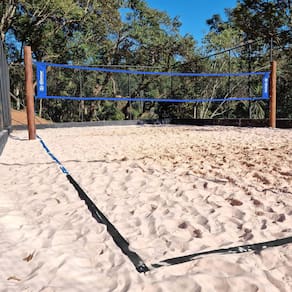 Especificações: - Tamanho da quadra: 8x16m - Material: Polipropileno CA - Contém: 6 fitas e 6 fixadores de ferro galvanizado - Cor: Preta e Azul - Espessura: 5cm