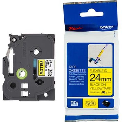 Fita laminada, modelo TZe FX651, de 12mm de largura, para utilização nos rotuladores PTouch. A fita FX651 possui fundo em amarelo e impressão em preto, recomendável para identificação de equipamentos e pastas, em empresas, escritórios, escolas, universidade, comércio, entre outros.