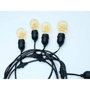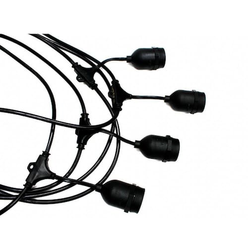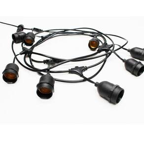 8x e27 Potência máxima: 25w por soquete Produzido em borracha, plástico e cobre Dimensões: Comprimento: 4,35m Distância entre soquetes: 55cm Queda do soquete: 14cm Uso interno ou externo no uso externo exceto a fonte Proteção: ip44 protegida contra a entrada de objetos sólidos estranhos maiores que 1 mm e também é protegida contra água borrifada de todas as direções Isolação emborrachada Lâmpadas não inclusas