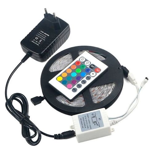Conexão: Não se aplica\ nConteúdo: UnidadeMaterial: Outros\ nSem atributos: Tipo: Outros acessórios\ nCaracterísticas: Ilumine a festa com esta faixa de luzes LED, que com suas diferentes cores e funções pode fazer brilhar até mesmo as comemorações mais infelizes. -Faixa multicolorida de 300 LEDs que permite escolher entre a função de flash intermitente, estroboscópio, desbotamento e suavidade. - Sistema adesivo branco de 3M. -Tem cor vermelha, verde e azul. INCLUI: fita de -5 metros. -Adaptador. -Transformador. -Controle remoto.