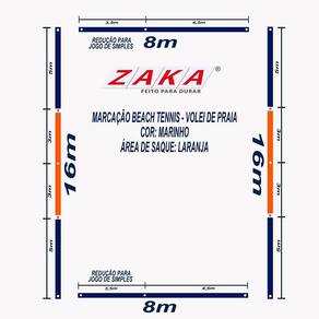 A linha de marcações da Zaka foi desenvolvida para proporcionar mais praticidade nos seus momentos de esporte e lazer. É indicada para jogos de beach tennis em dupla, simples e jogos de vôlei de praia. É um produto mais leve e mais resistente, com tecido anti mofo e anti UV que pode ser lavado facilmente. Material em tecido BMDNET (poliéster revestido com PVC) que não acumula areia sobre a fita e ilhoses de silicone que não enferrujam, garantindo maior durabilidade. Cores que se destacam facilmente na areia sendo a marcação do saque para beach tennis em cor diferente, facilitando o jogo. Possui também espeques em alumínio (não enferrujam) com a cabeça arredondada sendo muito mais seguro.