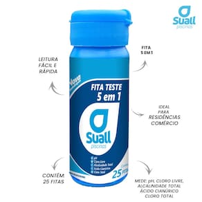 A Fita de Teste 5 em 1 Para Piscina Suall é ideal para garantir a qualidade da água da sua piscina, facilitando a análise de cinco parâmetros essenciais: cloro livre, pH, alcalinidade total, dureza e ácido cianúrico. Com uma leitura rápida e fácil, as fitas Suall proporcionam resultados precisos para o balanceamento químico, mantendo a água sempre segura e adequada para o uso. Com o uso regular, você assegura a saúde dos banhistas e preserva a durabilidade dos equipamentos de sua piscina. Contém 25 fitas de teste que possibilitam um monitoramento completo, garantindo conforto e segurança para todos os usuários.