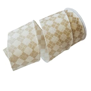 Fita Decorativa Natal aramada em poliéster quadriculada na cor bege com dourada, Rolo com ;9,14m de comprimento X 6.50cm de largura.