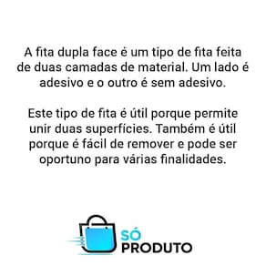 A fita dupla face é um tipo de fita feita de duas camadas de material. Um lado é adesivo e o outro é sem adesivo. Este tipo de fita é útil porque permite unir duas superfícies. Também é útil porque é fácil de remover e pode ser oportuno para várias finalidades. Por exemplo, você pode usar fita dupla face para prender pequenos itens na parede. .