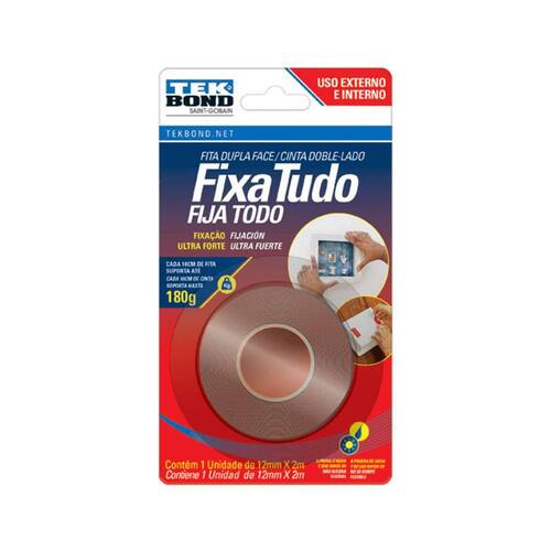 Fita Dupla Face Acrílica Uso Externo E Interno 12Mm X 2M Fixa Tudo Tekbond Características: A Supertape Fita Fixa Tudo Tekbond é uma fita acrílica que foi desenvolvida para promover uma fixação ultra forte de maneira fácil, rápida e segura. Com ela, você pendura quadros, objetos de decoração, canaletas e uma infinidade de outras peças. Adere muito bem em madeira, parede, vidro, acrílico e metal. Cinza, é indicada para uso interno e externo, mesmo aqueles expostos à luz do sol e umidade. Modo de Usar: 1. Faça a marcação prévia no local onde deseja aplicar o objeto desejado. Certifique-se de que a parede ou local onde deseja aplicar o objeto, bem como o próprio objeto, estejam livres de sujeira e oleosidade. 2. Corte a fita na medida e quantidade suficiente para sustentar este objeto cada 10cm sustenta 960g, desde que seja bem posicionada no objeto a ser fixado e que observe as 48h para qu a fita atinja 100% da sua capacidade de carga . 3. Aplique a fita no objeto desejado e remova o filme protetor. 4. Pressione o objeto com firmeza, por 1 minuto, no local desejado. Observações: Somente após o período de 48h a fita suportará 100% da sua capacidade de carga. Recomendamos a aplicação da fita em temperaturas entre 5°C e 40°C. Limitações: Não aplicar em locais com a presença de solventes. Não é recomendada para aplicação em papéis de parede. Não recomendamos a sobreposição de pedaços de fitas. Não recomendado para aplicações estruturais. Composição: Fita à base de filme polietileno e adesivo acrílico. Ean: 7898472262605