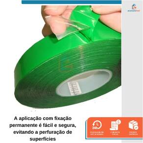 INSTRUÇÕES DE USO E MANUSEIO: 1. Faça a marcação prévia no local onde deseja aplicar o objeto desejado. Certifique-se de que a parede ou local onde deseja aplicar o objeto, bem como o próprio objeto estejam livres de sujeira e oleosidade; 2. Corte a fita na medida e quantidade suficiente para sustentar este objeto; 3. Aplique a fita no objeto desejado e remova o filme protetor; 4. Pressione o objeto com firmeza por 1 minuto no local desejado;