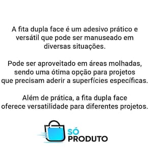Descrição A fita dupla face é um adesivo prático e versátil que pode ser manuseado em diversas situações. Pode ser aproveitado em áreas molhadas, sendo uma ótima opção para projetos que precisam aderir a superfícies específicas. Além de prática, a fita dupla face oferece versatilidade para diferentes projetos, podendo ser usada dos dois lados.
