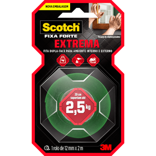 Fita Dupla face Scotch 12MM X 2M Fixação Extrema e Permanente - HB004750087 - 3M Descrição: A Fita Dupla Face 3M Scotch® Fixa Forte Fixação Extrema é a solução mais prática para fixar de forma permanente objetos de decoração pesados, como espelhos, quadros, painéis, lousas, entre outros. Sua aplicação é fácil, evitando furos e sujeira. O adesivo utilizado na fabricação desta fita é de alto desempenho e apresenta extraordinária força de fixação em aplicações de longa duração. A força de adesão e de coesão das fitas da família Fixa Forte são significativamente maiores do que das fitas adesivas convencionais. Detalhes: A Fita Dupla Face 3M Scotch® Fixa Forte Fixação Extrema é a solução mais prática para fixar de forma permanente objetos de decoração pesados, como espelhos, quadros, painéis, lousas, entre outros. Sua aplicação é fácil, evitando furos e sujeira. O adesivo utilizado na fabricação desta fita é de alto desempenho e apresenta extraordinária força de fixação em aplicações de longa duração. A força de adesão e de coesão das fitas da família Fixa Forte são significativamente maiores do que das fitas adesivas convencionais. Características: • Fixação Extrema e permanente - 20 cm suportam até 2,5 kg; • Substitui pregos e parafusos; • Para ambientes externos e internos; • Aplicação fácil, rápida e segura; • Contém: 1 rolo de 12 mm x 2 m. Aplicações sugeridas: • Painéis • Quadros grandes • Espelhos • Placas Especificações: • Tipo de produto: Fita • Comprimento (Métrico): 2 m • Largura (Métrica): 12 mm • Marca: 3M™ *Imagens meramente ilustrativas.