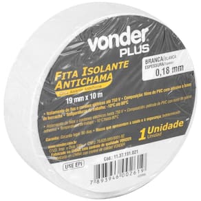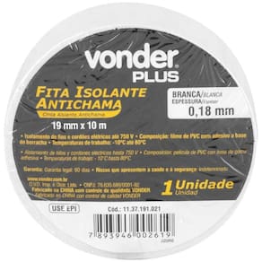 - Marca: Vonder; - Referência: 11.37.191.021; - Cor da fita isolante: Branca; - Tensão máxima de isolamento da fita isolante: 750V; - Material da fita isolante: Filme de PVC com adesivo a base de borracha; - Fita antichama com temperatura de trabalho de -10C até 80C; - Massa aproximada (peso): 0.05 kg; - Garantia legal: 90 dias.