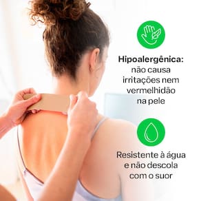 Hipoalergenica: nao causa irritacoes na pele; Resistente a agua e suor, e nao descola com facilidade da pele; Composicao: 93 algodao e 7 elastano.