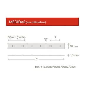 Características Gerais do Produto: • Referência: FTL-21 • Potência: 21 W/m • Fluxo Luminoso: 2700K 1720 Lumens/M - 4000K 1890 Lumens/M • Eficiência luminosa: 2700K 82 Lumens/W - 4000K 90 Lumens/W • IRC: 90 • Dimerizável: Sim • Tensão: 24 Vcc • Dimensões: 10mm x 5000mm • Especificação: 140 LEDs/m SMD 2216 • Material: Polímeros, Cobre e Componentes eletrônicos • Vida Útil: 36000 h • Grau de Proteção: IP 20 • Garantia: 5 Anos