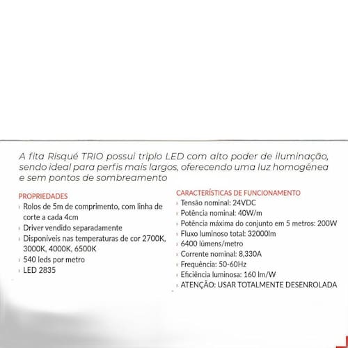 A fita led risqué trio da deluxe by avant é a solução perfeita para quem busca uma iluminação de alto desempenho, com design moderno e funcional. Com duplo led, ela oferece um alto poder de iluminação, ideal para perfis mais largos, garantindo uma luz homogênea e sem pontos de sombreamento.Características:alto brilho: possui 540 leds por metro, proporcionando uma iluminação potente e uniforme.Versatilidade: disponível em diversas temperaturas de cor 2700k, 3000k, 4000k, 6500k e rgb , permitindo personalizar o ambiente de acordo com suas necessidades.Facilidade de instalação: rolos de 5m com linha de corte a cada 4cm, facilitando o manuseio e a instalação.Durabilidade: com vida útil de 50.000 horas, garante longa durabilidade e economia de energia.Especificações técnicas:código: 297010346tensão nominal: 24vdcpotência nominal: 40w/mfluxo luminoso: 6400 lm/mtemperatura de cor: 2700k branco quente peso: 260ggarantia:a fita led risqué trio possui de 24 meses contra defeitos de fabricação.Deluxe by avant:a deluxe by avant é uma marca líder em soluções de iluminação led, oferecendo produtos de alta qualidade, design inovador e tecnologia de ponta. Com foco na sustentabilidade e na eficiência energética, a deluxe by avant busca proporcionar a melhor experiência em iluminação para seus clientes. Marca: Deluxe By Avant
