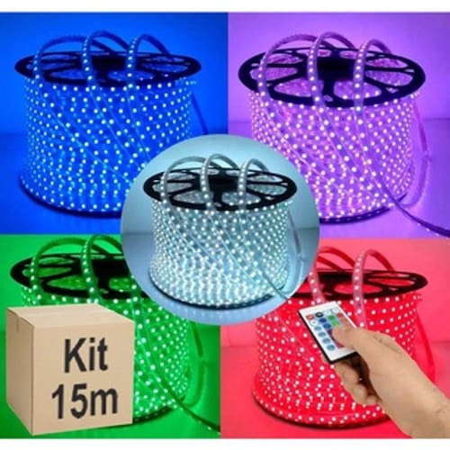 Acompanha fonte: SimÁreas Indicadas: Interno e ExternoComprimento: 15 metrosLargura: 1cmCor da Luz: RGB (Colorido) até 16 Cores SelecionaveisFonte de Energia: Cabo de AlimentaçãoTensão Elétrica: 110V (127V)LEDS por Metro: 60 LEDS por metroMaterial: SiliconeModelo do CHIP LED: 5050Origem: Fabricado na ChinaGarantia: 6 mesesPossui Funcão Dimerizável: SimTipo de Controle: Controle RemotoSeleção de cores, efeitos, botão liga desliga, dimerização e mais.